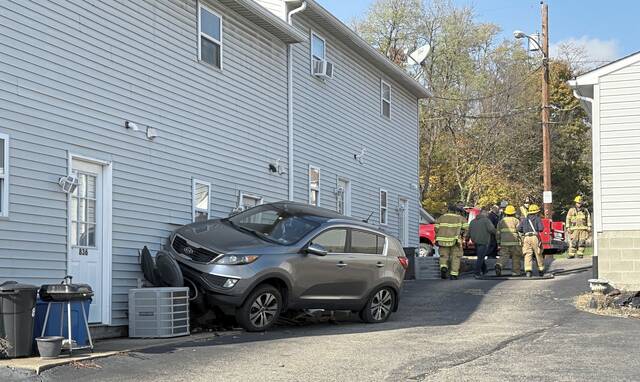 According to the man, the SUV came down Walnut Street from James Street, toward the municipal building. He saw the SUV turn right between his building and a garage, but turned late or wide, hitting part of the apron of the garage before accelerating between the buildings and hitting the back of the townhouse building.